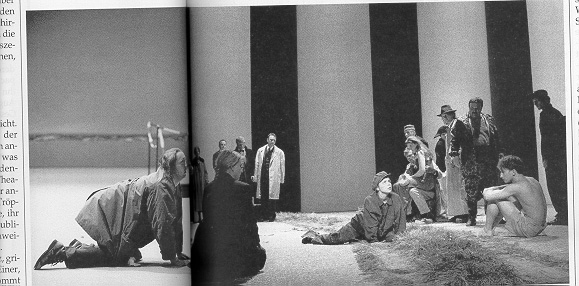 What kind of actions? The simplest, to start with, the merest phonemes of human behavior. "The stage is a spacious square in bright light," reads Handke's text. "It begins, in that someone swiftly walks off across it. Then, from the other direction/ another, likewise. Then two cross past each other likewise, each, at brief fixed interval, followed by a third and fourth, on the diagonal. Pause ...."